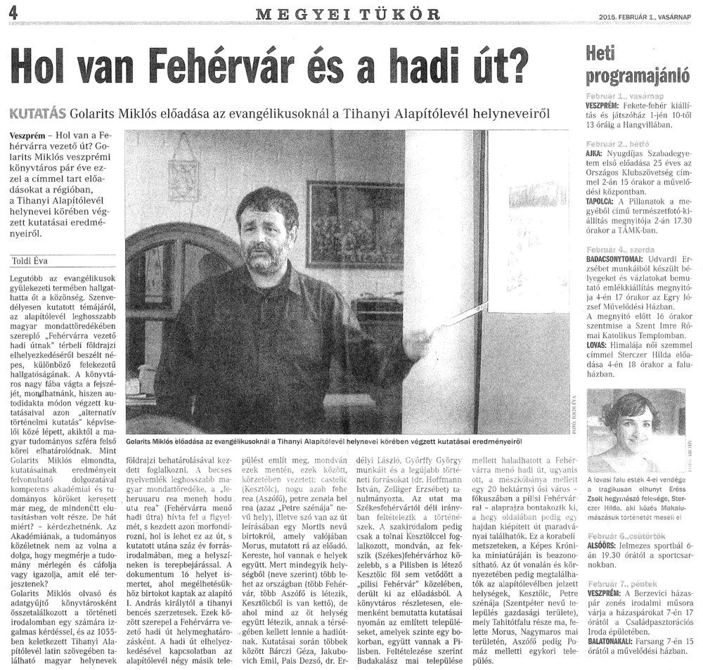 A Napló vasárnapi különszámában Toldi Éva riportja volt olvasható a veszprémi evangélikusoknál tartott előadásommal kapcsolatban. Az eredeti cikk található: Vasárnapi Napló (Veszprém) 2015. 16. évf. 5. sz. 4. p.